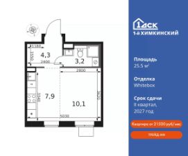 Семейная ипотека без наценки со скидками до 21% до конца августа!Прямая продажа от застройщика! Жилой Комплекс класса Комфорт.Продаётся студия номер 94 общей площадью 25.6 кв.м на 8-м этаже 17 этажного дома. Отделка Whitebox.Особенности:- Квартира доступна к покупке в Trade-In.- Линейная планировка - максимальная функциональность и удобство.- Увеличенное число окон- Линейная кухня - функциональность и практичность в одном решении.- Стандартное количество квартир на этаже - оптимальный выбор для городской жизни.- Ниша под шкаф - компактное и удобное место для вещей.- Вид из окна: главная улица- Купи сейчас - плати потом!Квартира с предчистовой отделкой (White box). Вам не придётся заниматься черновыми трудоёмкими работами, а чистовую отделку и дизайн сделаете по своему вкусу.Расположение комплекса: Квартал класса комфорт плюс, где современное городское пространство граничит с удивительной природой вокруг. 1-й Химкинский расположен на территории в 102 га и органично вписан в природное окружение Химкинского леса и канала им. Москвы. В проекте предусмотрена богатая коммерческая инфраструктура с собственным торговым центром, общеобразовательные учреждения и социальные объекты. Изюминкой жилого комплекса будут спортивно-оздоровительный комплекс с термами и SPA и семейный парк развлечений.Транспортная доступность:ЖК ''1-й Химкинский'' дает возможность выбрать любой способ передвижения как до города, так и до самых разных объектов, которые могут представлять интерес для его жителей. Не важно, какой способ передвижения вы предпочитаете, успевать всегда и везде можно вне зависимости от выбора транспорта. - 8 мин. пешком (800 м) до остановки ''Золотая Арка''- 10 мин пешком (1 км) до остановки ''Поворот на Ивакино''Внутренняя инфраструктура:- Безопасность: закрытые дворы без машин, безбарьерная среда и сквозные подъезды, камеры на детских площадках с возможностью трансляции на смартфоне- Идеальный отдых в кругу семьи: семейный парк развлечений на территории, торговый центр (2-х этажный) общей площадью более 8 тыс. кв. м с фудкортом- Образование: 3 детских сада и современная муниципальная школа на 2450 мест- Спортивная среда: закольцованный веломаршрут с навигацией, спортивный комплекс с термами, закрытый тренажерный зал и зоны ворк-аута- Социальные объекты: поликлиника со станцией скорой помощи, пожарное депо- Подземный паркинг и кладовые помещения на -1 этаже, станция техобслуживания и автомойка на территории.