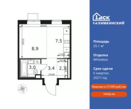Семейная ипотека без наценки со скидками до 21% до конца августа!Прямая продажа от застройщика! Жилой Комплекс класса Комфорт.Продаётся студия номер 424 общей площадью 25.1 кв.м на 11-м этаже 12 этажного дома. Отделка Whitebox.Особенности:- Квартира доступна к покупке в Trade-In.- Линейная планировка - максимальная функциональность и удобство.- Увеличенное число окон- Линейная кухня - функциональность и практичность в одном решении.- Стандартное количество квартир на этаже - оптимальный выбор для городской жизни.- Гардеробная - удобство для хранения и организации вещей.- Вид из окна на детский сад- Вид из окна: улица- Купи сейчас - плати потом!Квартира с предчистовой отделкой (White box). Вам не придётся заниматься черновыми трудоёмкими работами, а чистовую отделку и дизайн сделаете по своему вкусу.Расположение комплекса: Квартал класса комфорт плюс, где современное городское пространство граничит с удивительной природой вокруг. 1-й Химкинский расположен на территории в 102 га и органично вписан в природное окружение Химкинского леса и канала им. Москвы. В проекте предусмотрена богатая коммерческая инфраструктура с собственным торговым центром, общеобразовательные учреждения и социальные объекты. Изюминкой жилого комплекса будут спортивно-оздоровительный комплекс с термами и SPA и семейный парк развлечений.Транспортная доступность:ЖК ''1-й Химкинский'' дает возможность выбрать любой способ передвижения как до города, так и до самых разных объектов, которые могут представлять интерес для его жителей. Не важно, какой способ передвижения вы предпочитаете, успевать всегда и везде можно вне зависимости от выбора транспорта. - 8 мин. пешком (800 м) до остановки ''Золотая Арка''- 10 мин пешком (1 км) до остановки ''Поворот на Ивакино''Внутренняя инфраструктура:- Безопасность: закрытые дворы без машин, безбарьерная среда и сквозные подъезды, камеры на детских площадках с возможностью трансляции на смартфоне- Идеальный отдых в кругу семьи: семейный парк развлечений на территории, торговый центр (2-х этажный) общей площадью более 8 тыс. кв. м с фудкортом- Образование: 3 детских сада и современная муниципальная школа на 2450 мест- Спортивная среда: закольцованный веломаршрут с навигацией, спортивный комплекс с термами, закрытый тренажерный зал и зоны ворк-аута- Социальные объекты: поликлиника со станцией скорой помощи, пожарное депо- Подземный паркинг и кладовые помещения на -1 этаже, станция техобслуживания и автомойка на территории.
