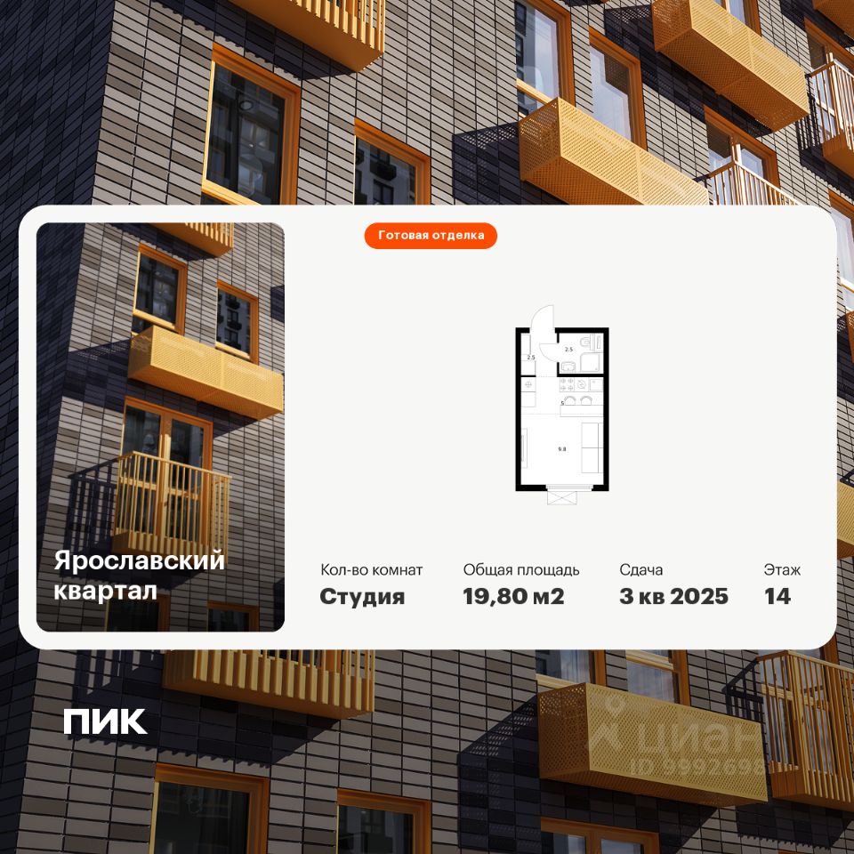 Продаётся квартира-студия площадью 19,8 кв.м на 14 этаже 25 этажного дома (Корпус 1.1, Секция 1) проекта ПИК Ярославский квартал. Светлый просторный подъезд на уровне земли, функциональная планировка, большие окна, c отделкой. Проект ''Ярославский квартал'' возводится в Мытищах, в 6 км от МКАД. Жилой квартал, состоящий из 8 корпусов, строится рядом с Ярославским шоссе и имеет удобный заезд с крупной автомагистрали. На территории проекта появится школа, детский сад и пешеходный бульвар. Индивидуальные дизайны фасадов для ''Ярославского квартала'' разработало петербургское архитектурное бюро RHIZOME. В их портфолио вошли работы для Московского музея современного искусства, ГЦСИ, Манифеста 10 и ЦВЗ Манеж. За 7 минут можно дойти пешком до ближайшей автобусной остановки. Столько же займёт дорога до ''Лосиного острова'' - облагороженного парка с разными активностями для всей семьи, благоустроенными зонами для отдыха, местами для прогулок и пробежек на свежем воздухе. Доехать на автомобиле до Ярославского шоссе получится за 3 минуты, до станции ''Мытищи'' - за 9 минут, до МКАД - за 15 минут. Артикул 910487 (Застройщик ООО ''Специализированный ''ГЕОПАРК'')