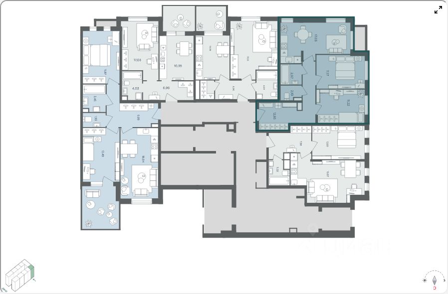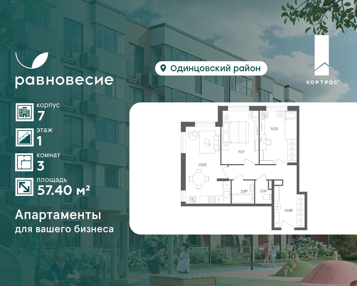 Продаётся апартамент с 3 комнатами общей площадью 57.40 кв. метров на 1 этаже жилого квартала комфорт-класса ''Равновесие''.