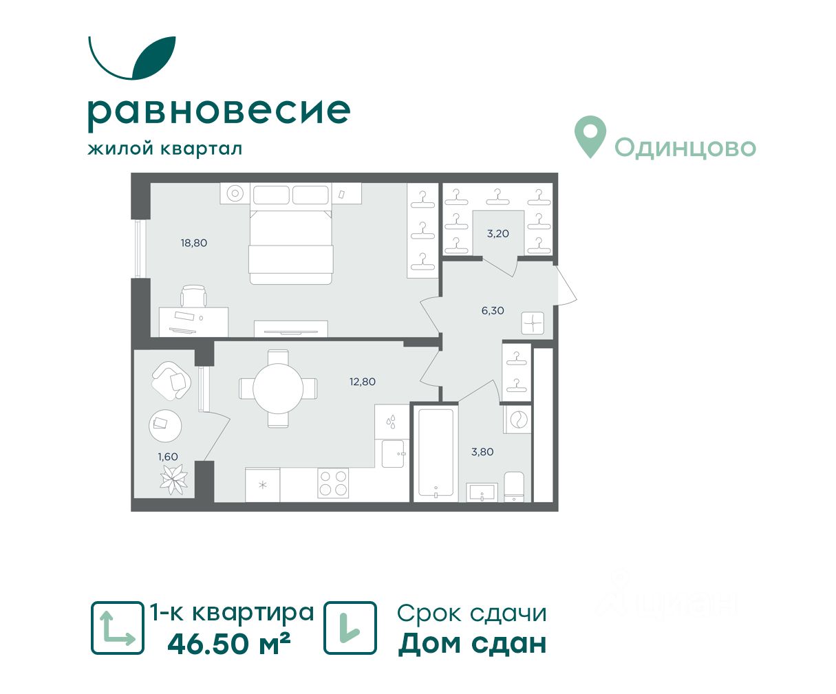 Продаётся квартира с 1 комнатой общей площадью 46.50 кв. метров на 6 этаже жилого квартала комфорт-класса ''Равновесие''.