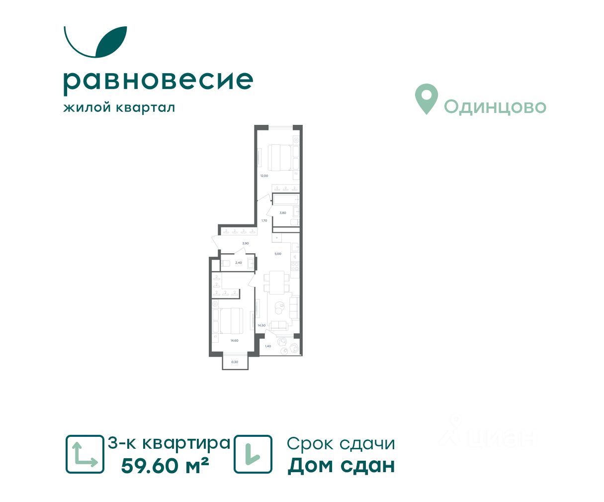 Продаётся квартира с 3 комнатами общей площадью 59.60 кв. метров на 6 этаже жилого квартала комфорт-класса ''Равновесие''.