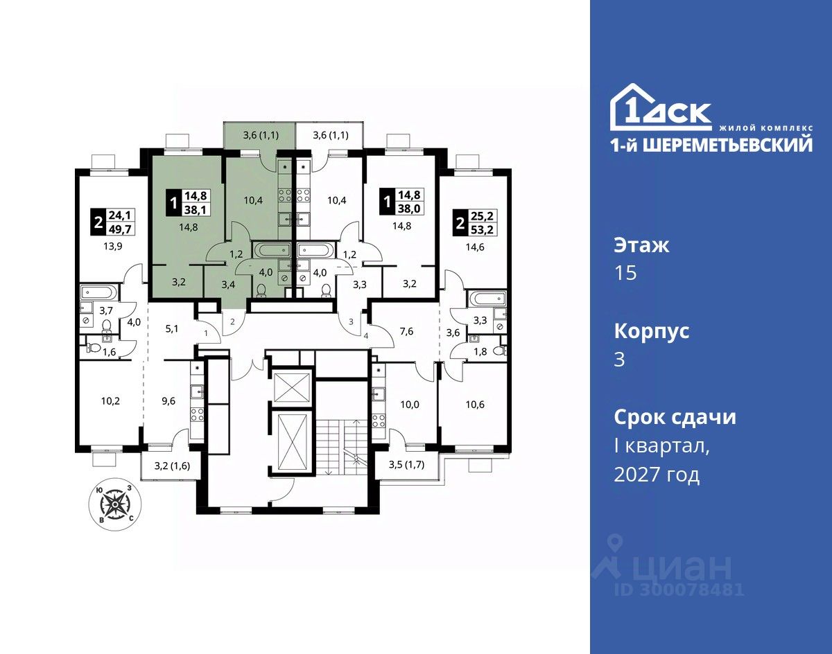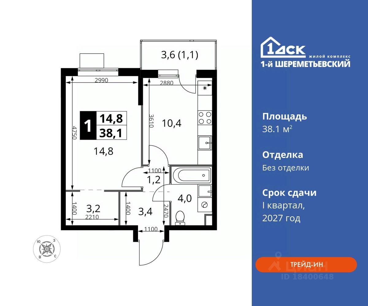 Максимальные скидки при 100% оплате. Прямая продажа от застройщика! Жилой Комплекс класса Комфорт плюс. Продаётся 1-к квартира номер 821 общей площадью 38.1 кв.м на 15-м этаже 17 этажного дома. Без отделки.
