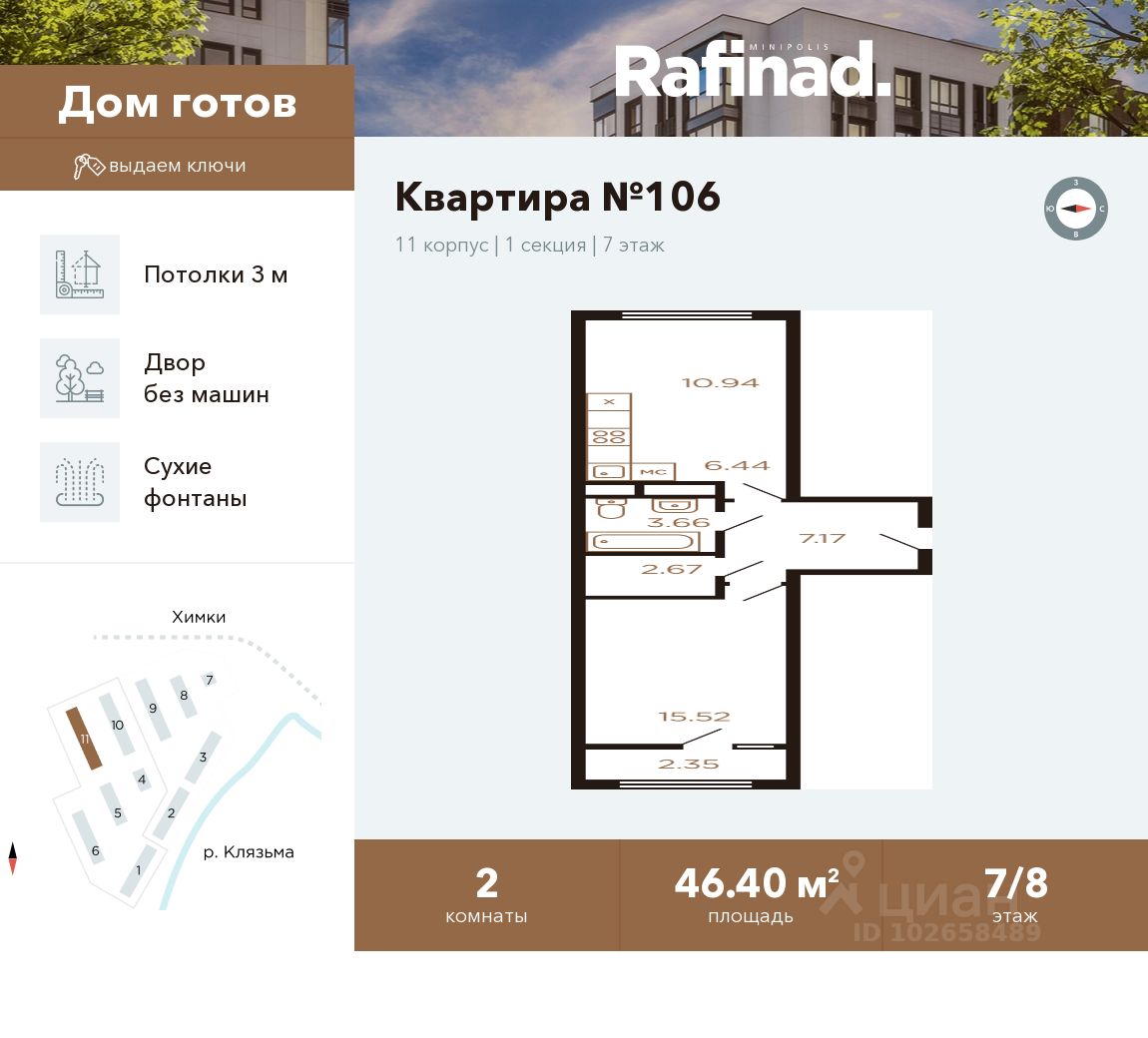 Продаётся 2-комнатная квартира общей площадью 46.40 м² на 7 этаже.