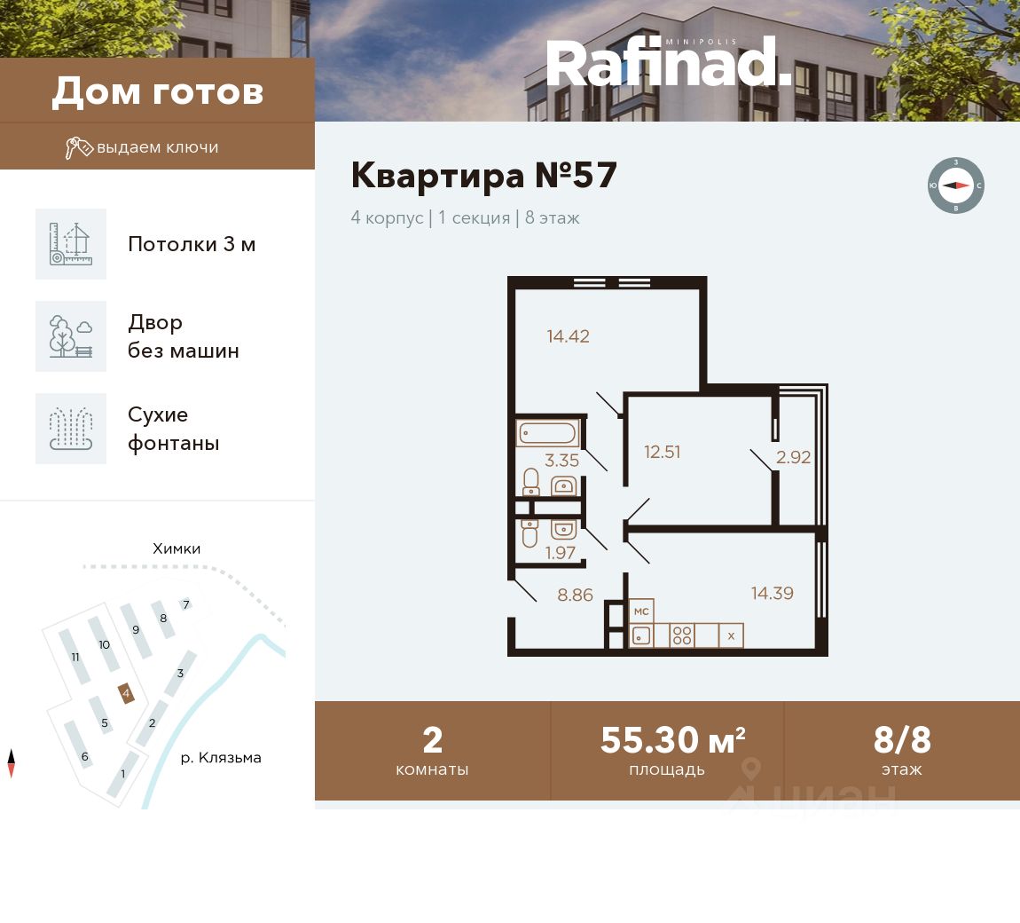 Продаётся 2-комнатная квартира общей площадью 55.30 м² на 8 этаже.