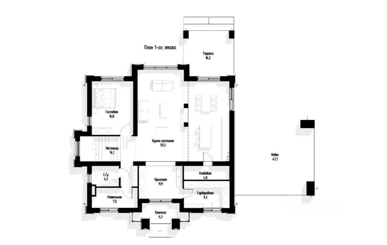 На первом этаже расположены прихожая, просторная кухня-гостиная 59 кв.м, гостевая комната, санузел, котельная, кладовая и большая терраса. На втором этаже находятся три спальни, два санузла и три гардеробные. Вид разрешенного использования земли - ИЖС.