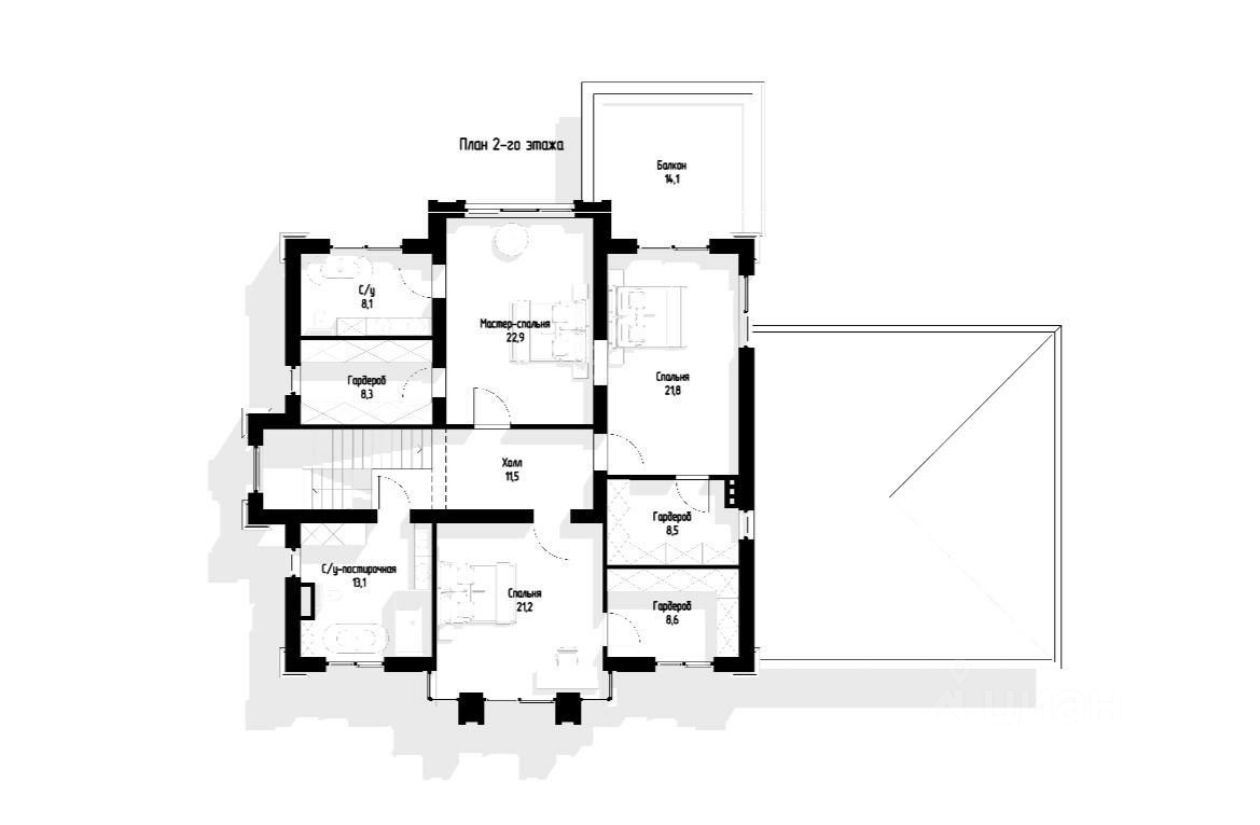 На первом этаже расположены прихожая, просторная кухня-гостиная 59 кв.м, гостевая комната, санузел, котельная, кладовая и большая терраса. На втором этаже находятся три спальни, два санузла и три гардеробные. Вид разрешенного использования земли - ИЖС. Все центральные коммуникации по границе участка (водопровод, канализация, электричество, магистральный газ, ливневая канализация, оптоволоконный интернет). Круглосуточная охрана, въезд по пропускам.