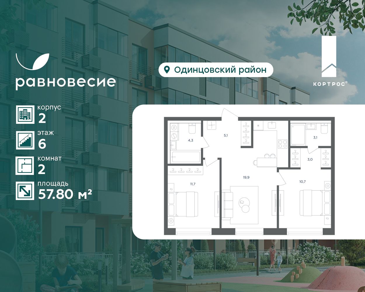Продаётся квартира с 2 комнатами общей площадью 57.80 кв. метров на 6 этаже жилого квартала комфорт-класса ''Равновесие''.