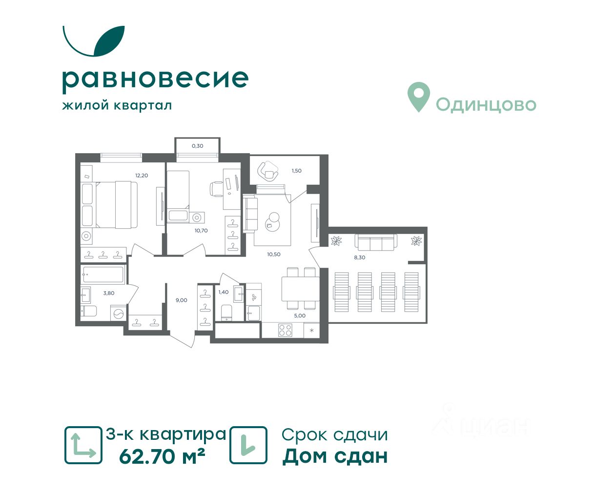 Продаётся квартира с 3 комнатами общей площадью 62.70 кв. метров на 6 этаже жилого квартала комфорт-класса ''Равновесие''.