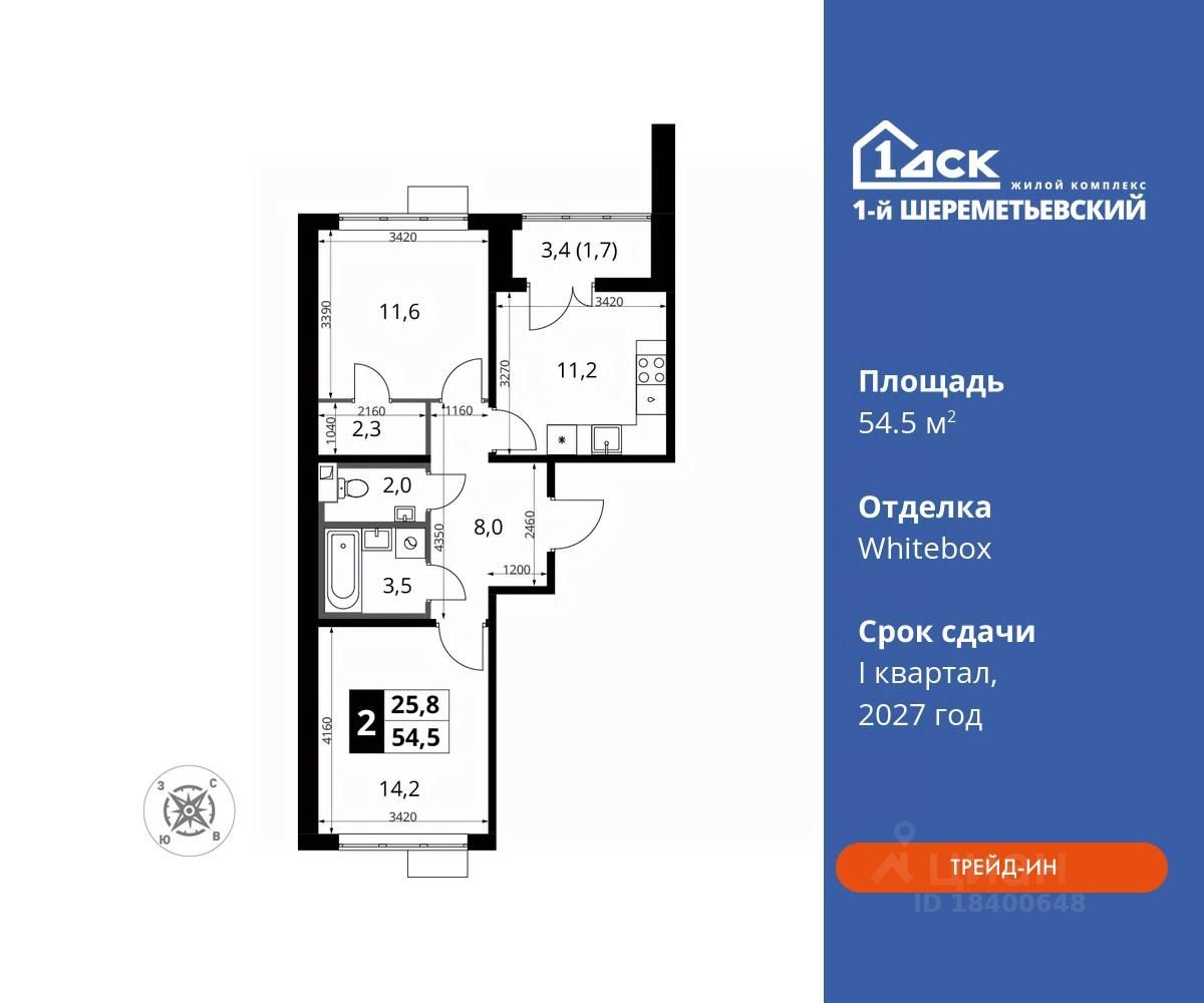 Максимальные скидки при 100% оплате. Прямая продажа от застройщика! Жилой Комплекс класса Комфорт плюс. Продаётся 2-к квартира номер 641 общей площадью 54.5 кв.м на 15-м этаже 16 этажного дома. Отделка Whitebox.