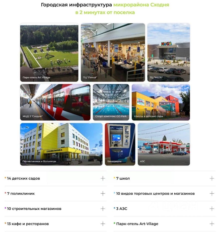 Поселок находится в 15 минутах езды от МКАД с полной инфраструктурой г. Москва и г. Химки. В пешей доступности от поселка расположена остановка общественного транспорта, МЦД Сходня (30 минут до центра Москвы на метро). Всего 2 минуты пешком: магазины, два авторских ресторана, комплекс с саунами и банями Art Village, где есть пляж, бассейн, фитнес-зал и SPA, конный клуб, современный wellness - центр площадью 2500 м2 со спортивным бассейном, термальным комплексом и фитнес-зоной, spa-комплекс, 2 открытых бассейна с комфортными пляжами в летний сезон, кальянная, русские бани на дровах с бочками Фурако на открытом воздухе.