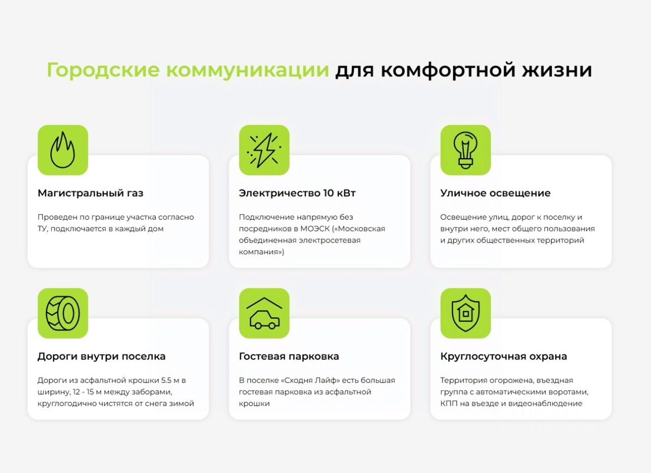 1. ПОСЕЛОК БИЗНЕС КЛАССА. 2. Закрытая территория в окружении леса 3. Семейная ипотека от 6% (застройщик и поселок аккредитован в 8 банках) 4. 15 минутах езды от МКАД 5. Газ/ Электричество / Вода/ Канализация / Дренаж / Видеонаблюдение