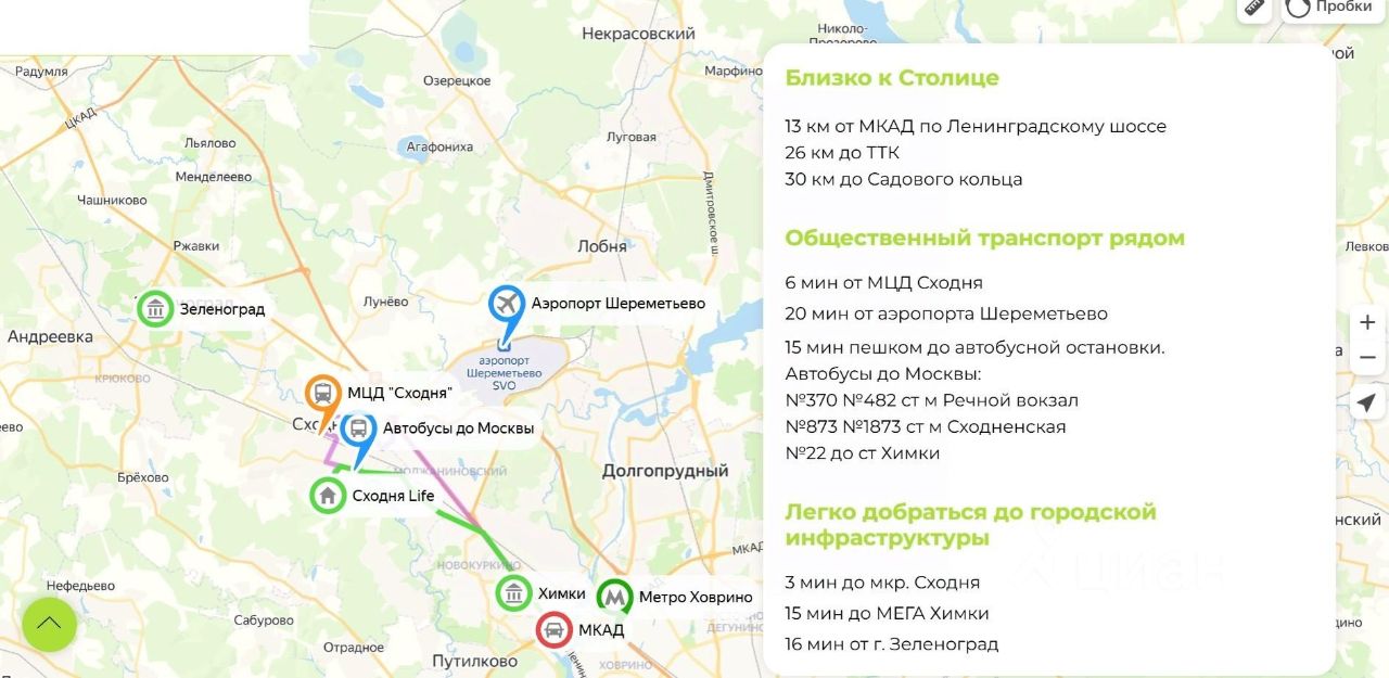 Поселок находится в 15 минутах езды от МКАД с полной инфраструктурой г. Москва и г. Химки. В пешей доступности от поселка расположена остановка общественного транспорта, МЦД Сходня (30 минут до центра Москвы на метро).