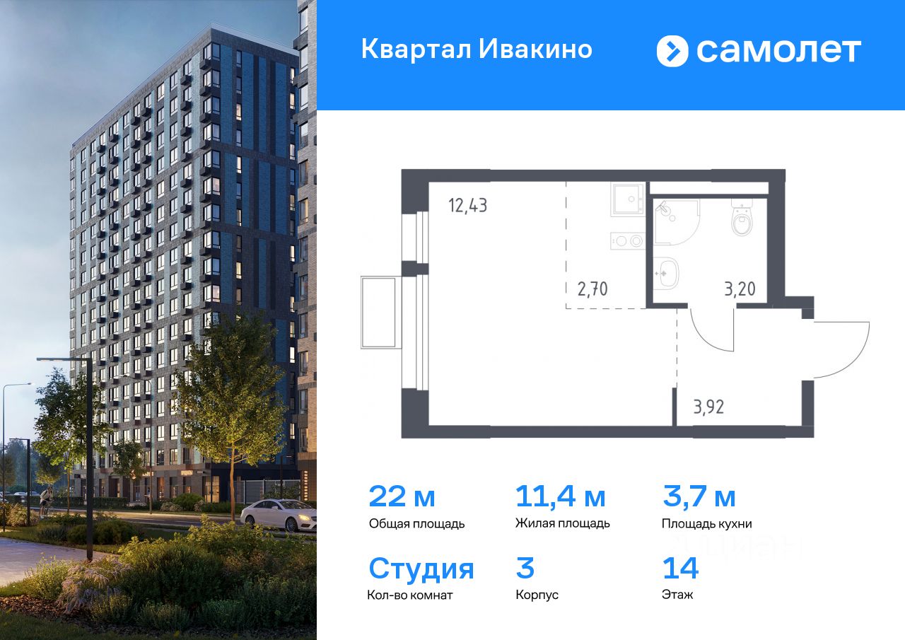 Предлагается квартира студия комфорт-класса 22 кв.м в корпусе 3 на 14 этаже, в ЖК ''Квартал Ивакино'' Квартира с предчистовой отделкой. Доступность дополнительных опций уточняйте у застройщика.