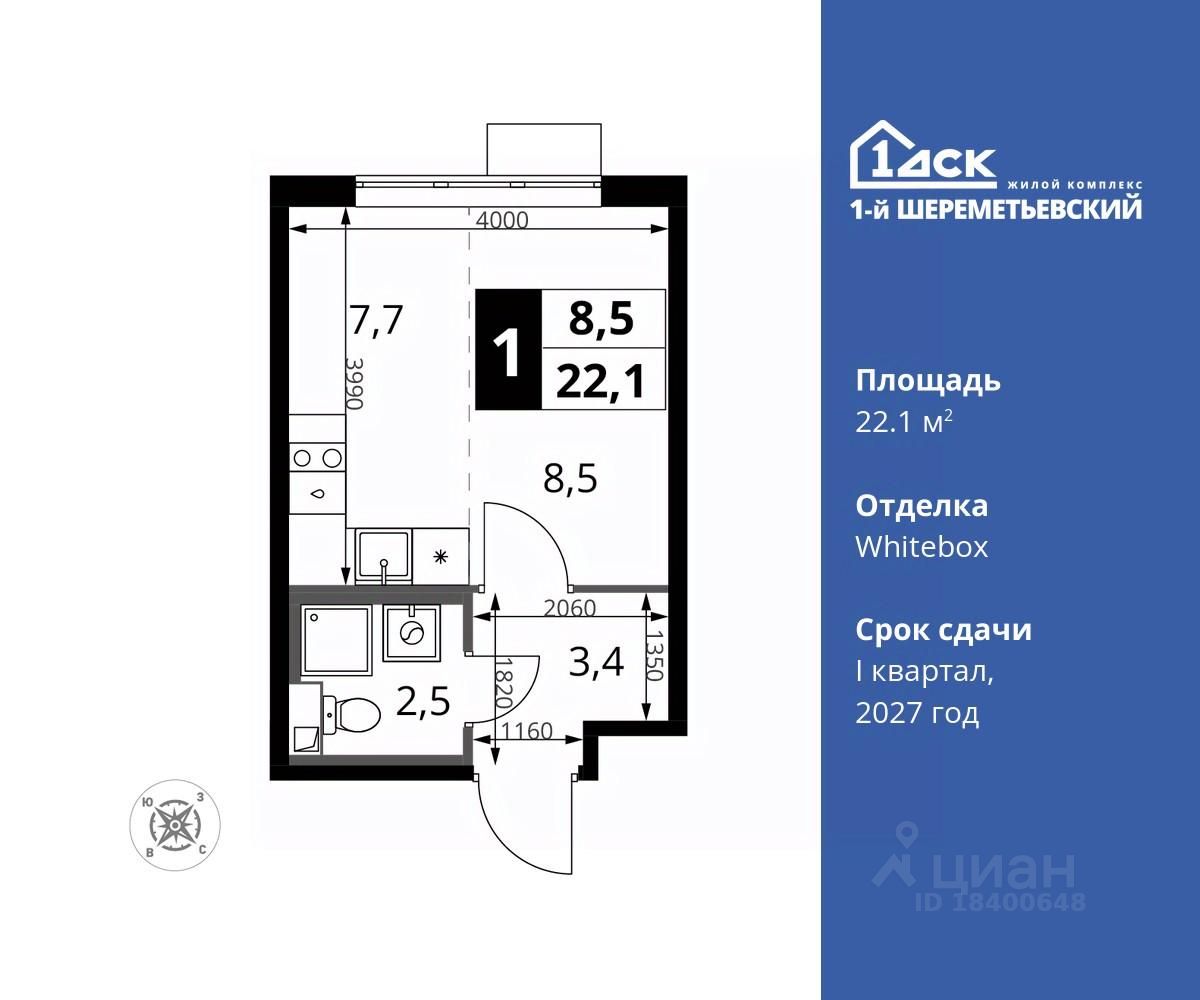 Максимальные скидки при 100% оплате. Прямая продажа от застройщика! Жилой Комплекс класса Комфорт плюс. Продаётся студия номер 843 общей площадью 22.1 кв.м на 14-м этаже 16 этажного дома. Отделка Whitebox.