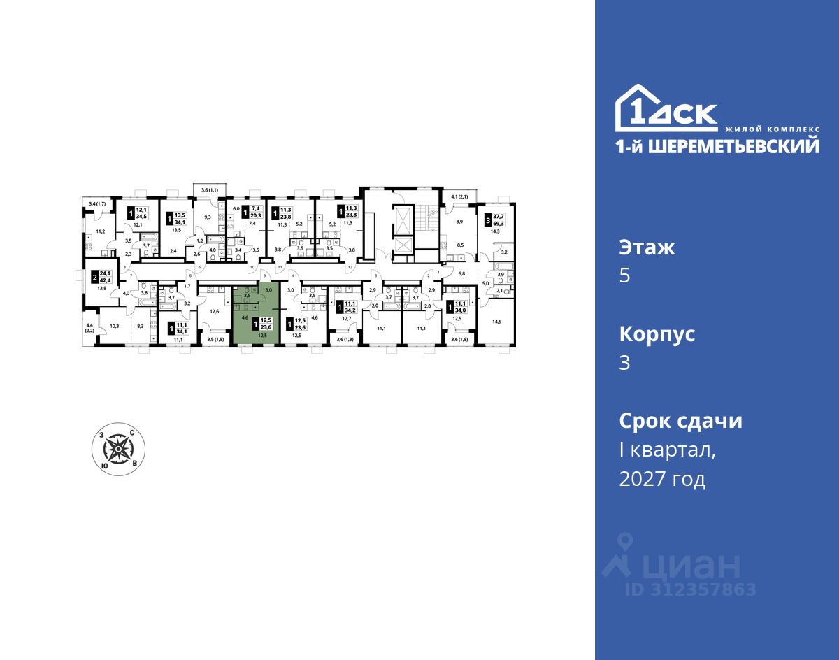 Максимальные скидки при 100% оплате. Прямая продажа от застройщика! Жилой Комплекс класса Комфорт плюс. Продаётся студия номер 1214 общей площадью 23.6 кв.м на 5-м этаже 17 этажного дома. Без отделки.