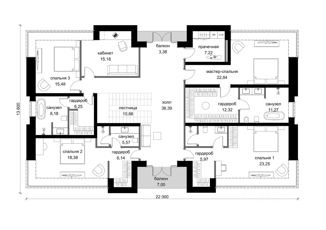 На втором этаже: * Роскошная мастер-спальня с собственной ванной комнатой и гардеробной * Три дополнительные спальни, которые также включают санузлы и гардеробные