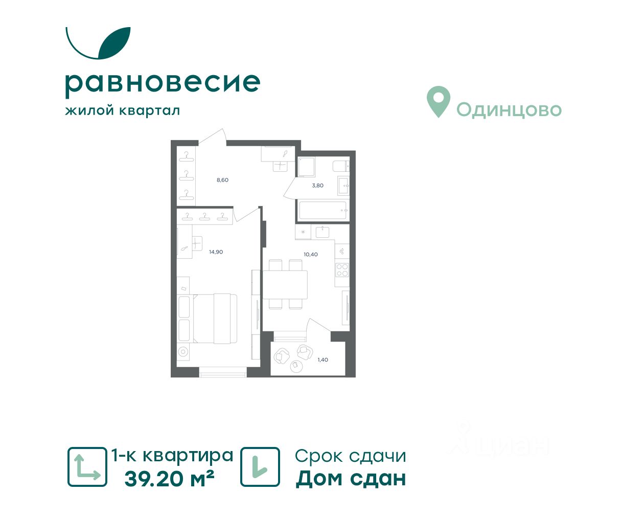 Продаётся квартира с 1 комнатой общей площадью 39.20 кв. метров на 4 этаже жилого квартала комфорт-класса ''Равновесие''.