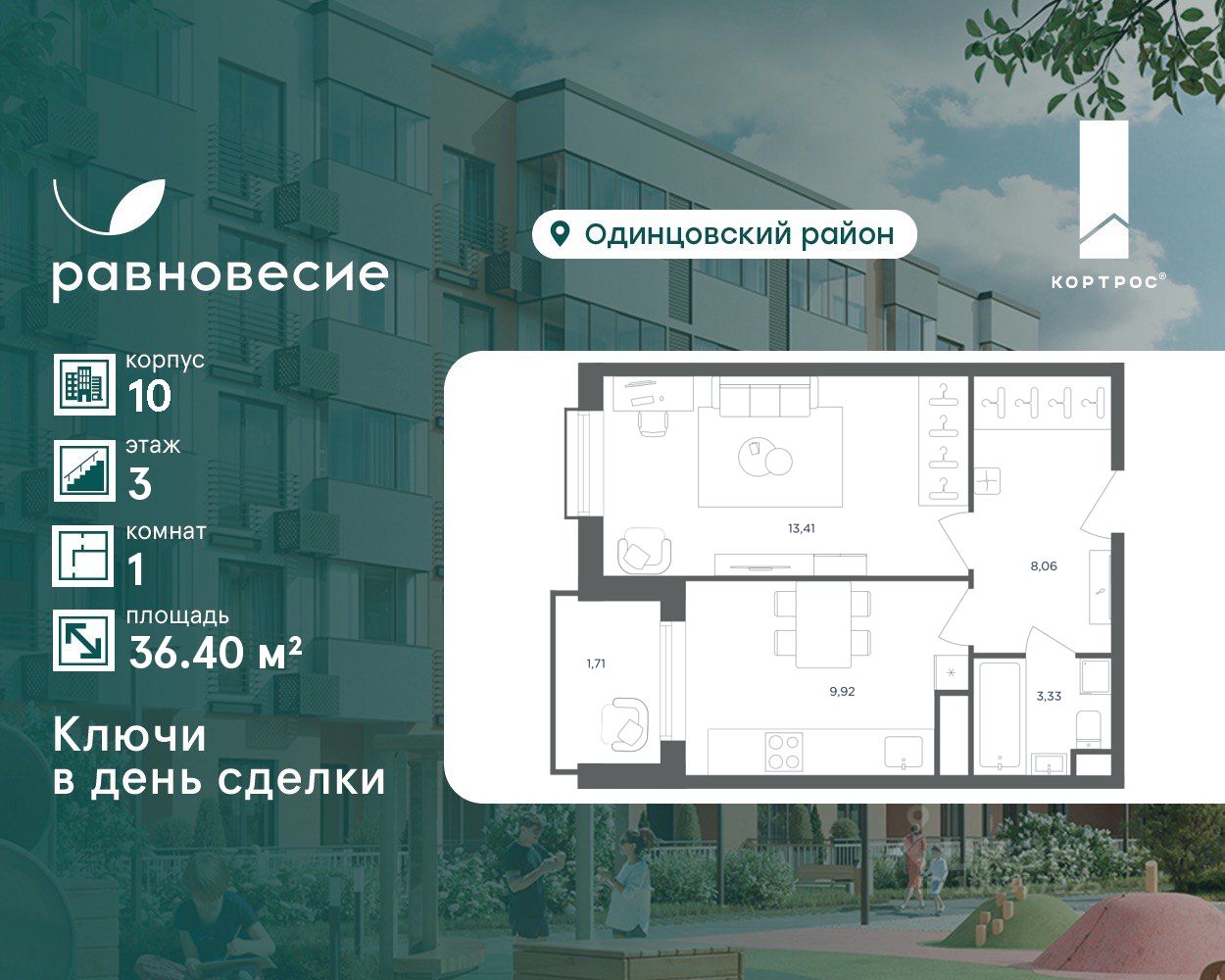Продаётся квартира с 1 комнатой общей площадью 36.40 кв. метров на 3 этаже жилого квартала комфорт-класса ''Равновесие''.