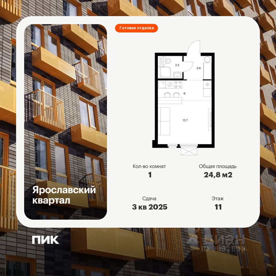 Продаётся квартира-студия площадью 24,8 кв.м на 11 этаже 24 этажного дома (Корпус 1.3, Секция 1) проекта ПИК Ярославский квартал. Светлый просторный подъезд на уровне земли, функциональная планировка, большие окна, c отделкой.