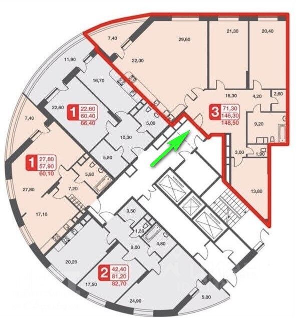 Комфортный 6 этаж, кухня 22кв.м., широкий коридор, есть гардеробная комната 13,8кв.м., комнаты 29, 21 и 20кв.м., лоджия 7,4кв.м., два санузла.
