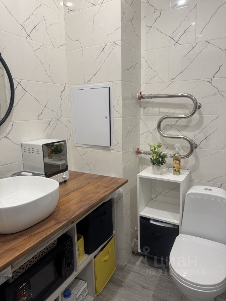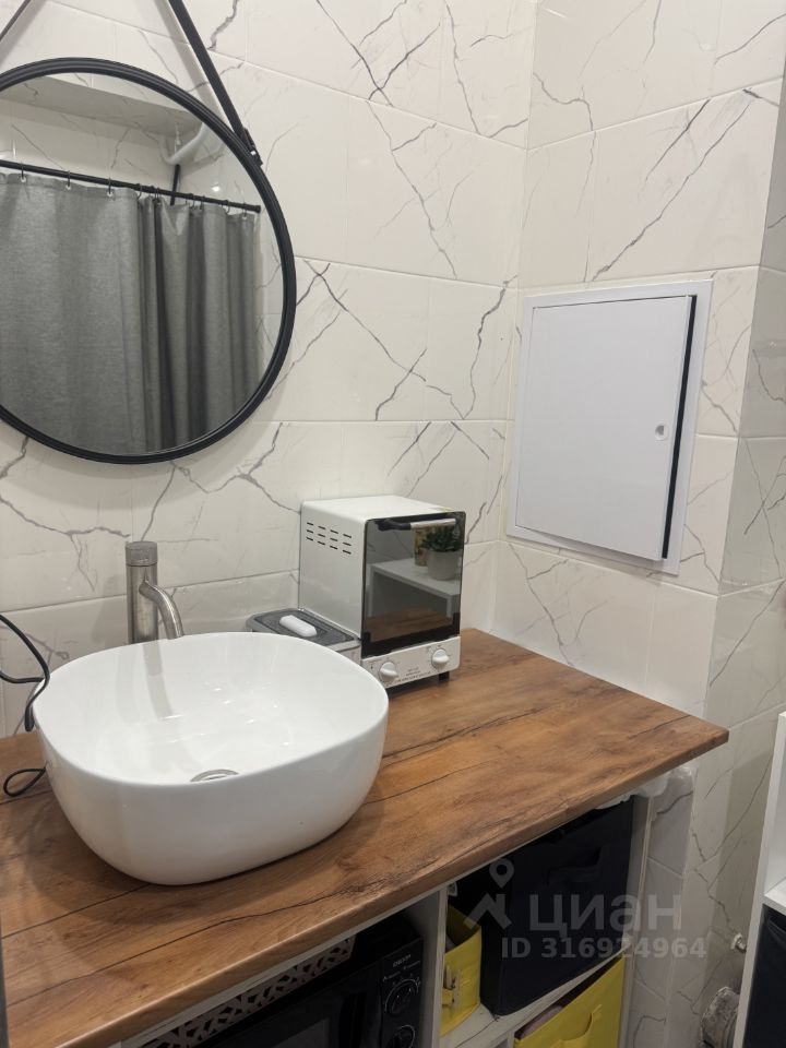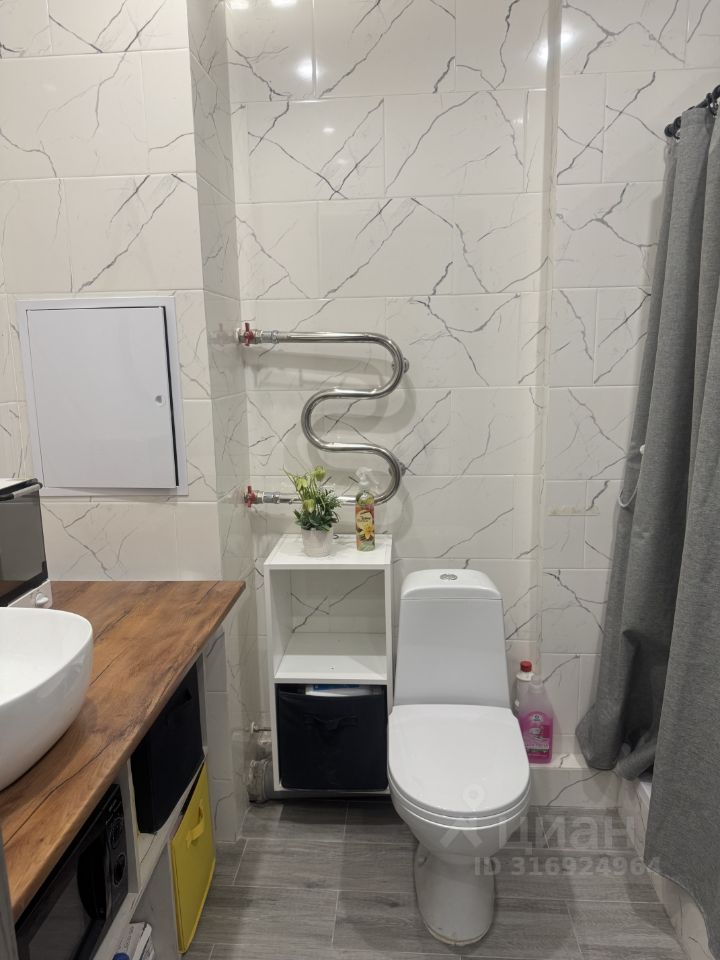 Пространство студии организовано с учётом функциональности. Санузел совмещённый, оборудован всем необходимым.