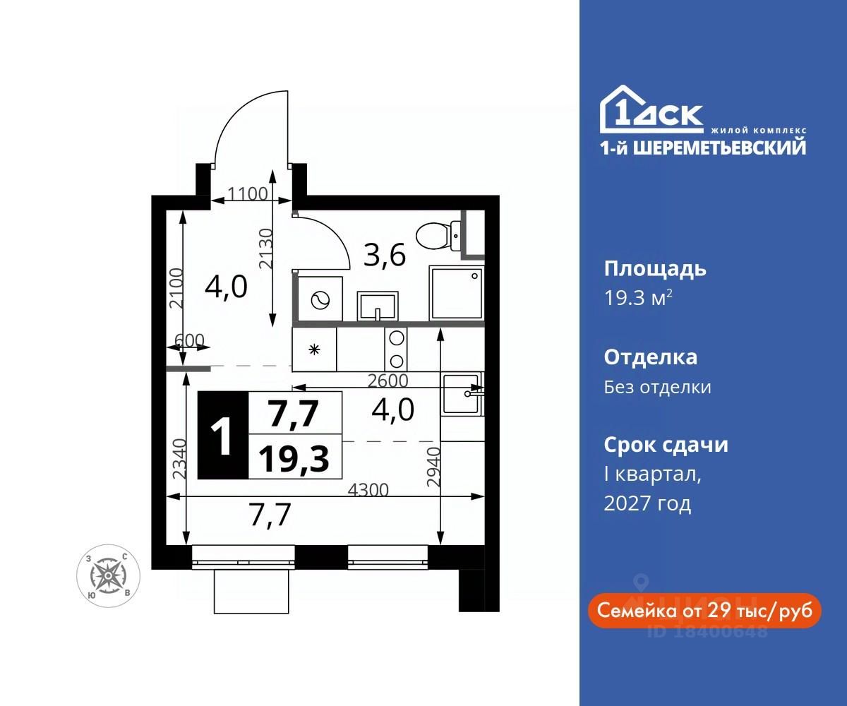 Максимальные скидки при 100% оплате. Прямая продажа от застройщика! Жилой Комплекс класса Комфорт плюс. Продаётся студия номер 1066 общей площадью 19.3 кв.м на 9-м этаже 17 этажного дома. Без отделки.
