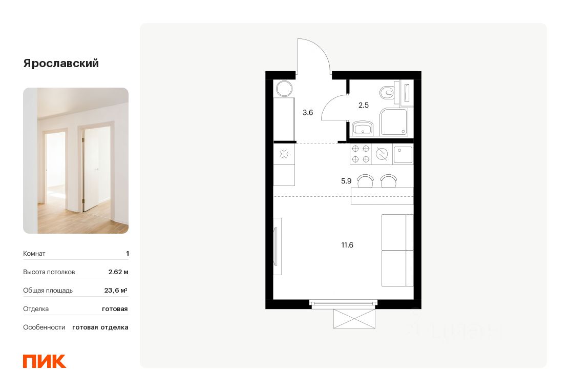 Продаётся квартира-студия площадью 23,6 кв.м на 9 этаже 25 этажного дома (Корпус 16.3, Секция 3) проекта ПИК Ярославский. Светлый просторный подъезд на уровне земли, функциональная планировка, большие окна, c отделкой.