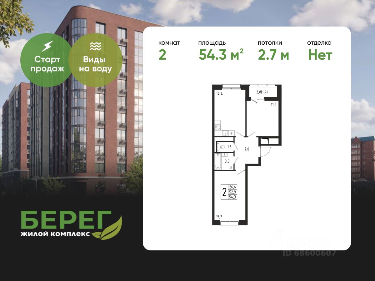 Продаётся 2-комнатная квартира в строящемся доме (Корпус 4 (2 очередь)), общей площадью 54.30 кв.м., на 3 этаже.