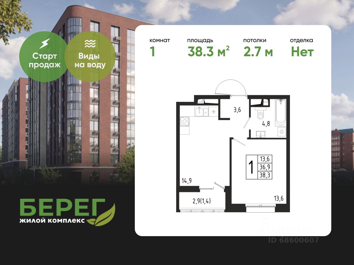Продаётся 1-комнатная квартира в строящемся доме (Корпус 4 (2 очередь)), общей площадью 38.30 кв.м., на 4 этаже.