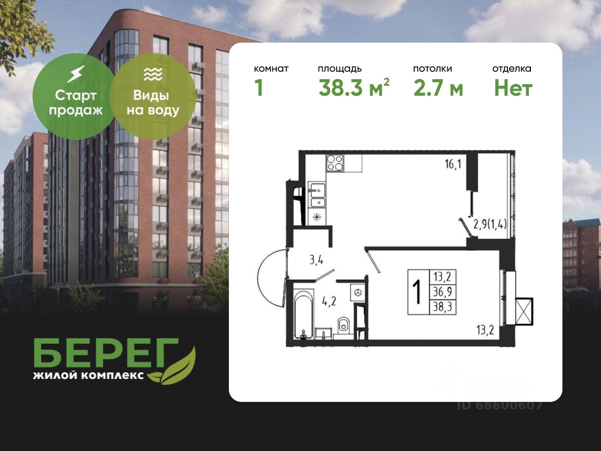 Продаётся 1-комнатная квартира в строящемся доме (Корпус 8 (2 очередь)), общей площадью 38.30 кв.м., на 7 этаже.