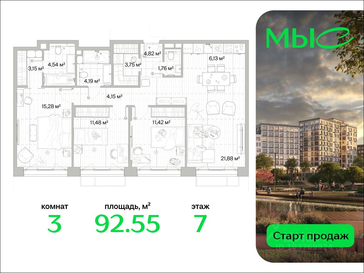 В продаже квартира площадью 92.55 кв. м без отделки на 7 этаже 12 этажного дома. Квартира находится в премиальном жилом комплексе ''МЫС'' (Застройщик - MR Group).