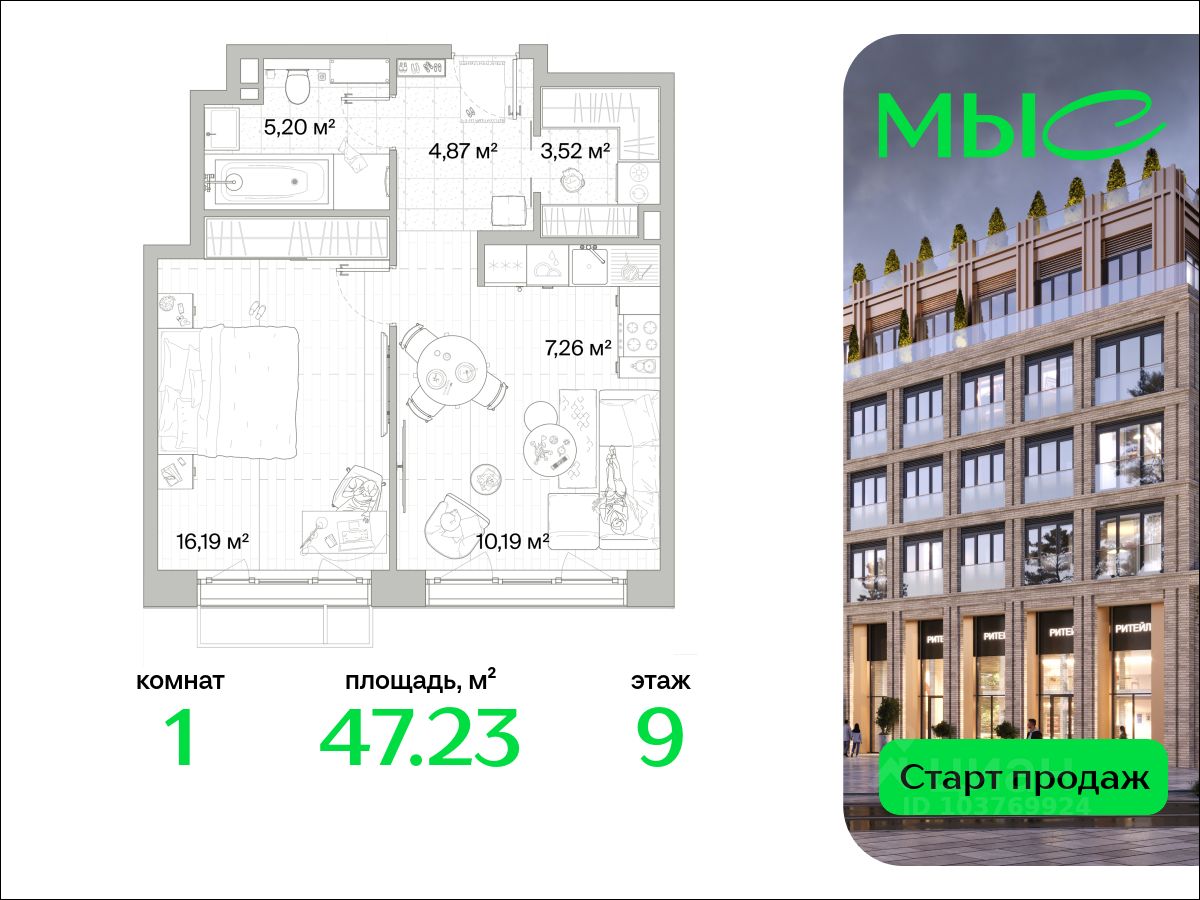 В продаже квартира площадью 47.23 кв. м без отделки на 9 этаже 10 этажного дома. Квартира находится в премиальном жилом комплексе ''МЫС'' (Застройщик - MR Group).