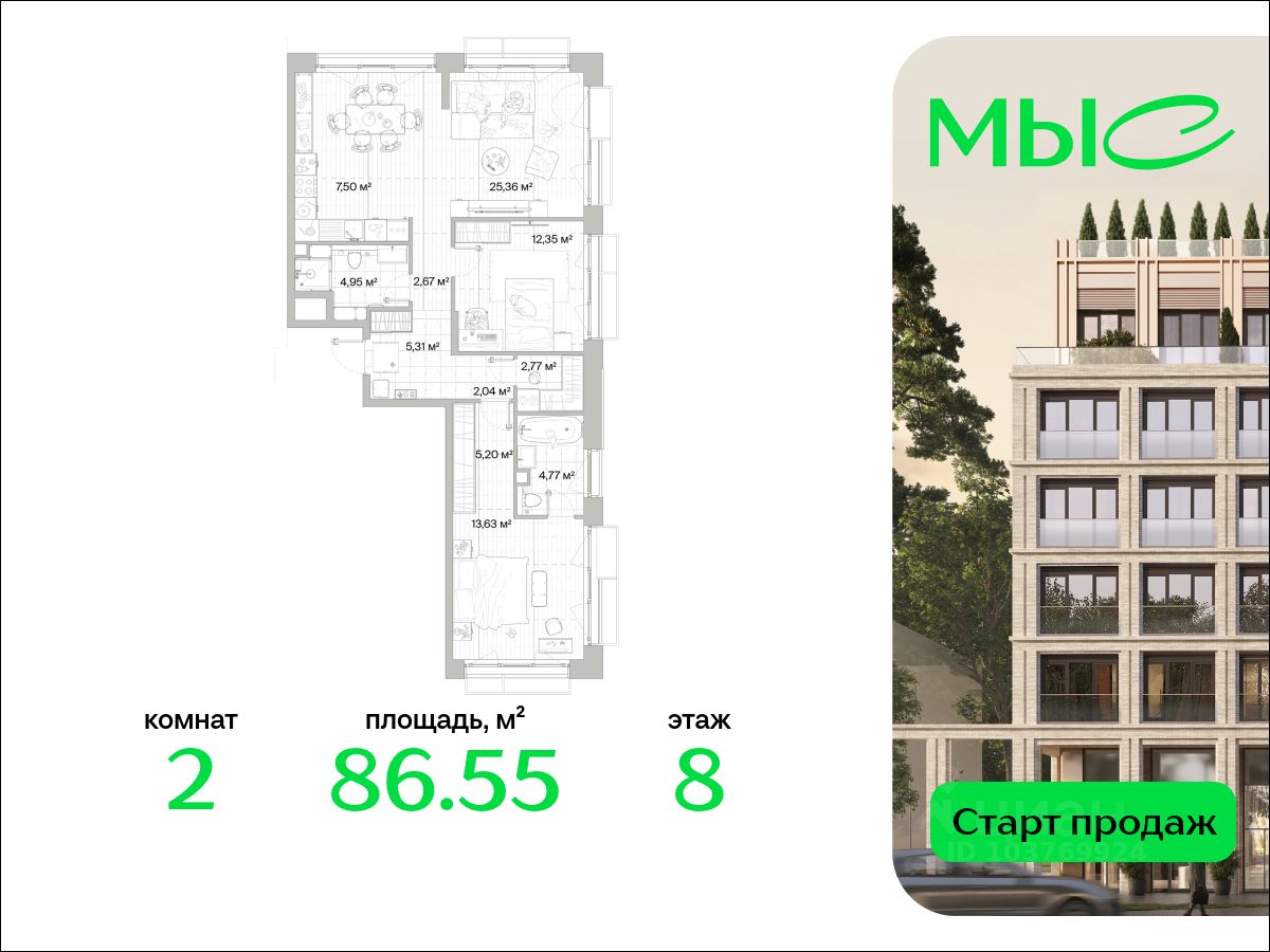 В продаже квартира площадью 86.55 кв. м без отделки на 8 этаже 10 этажного дома. Квартира находится в премиальном жилом комплексе ''МЫС'' (Застройщик - MR Group).