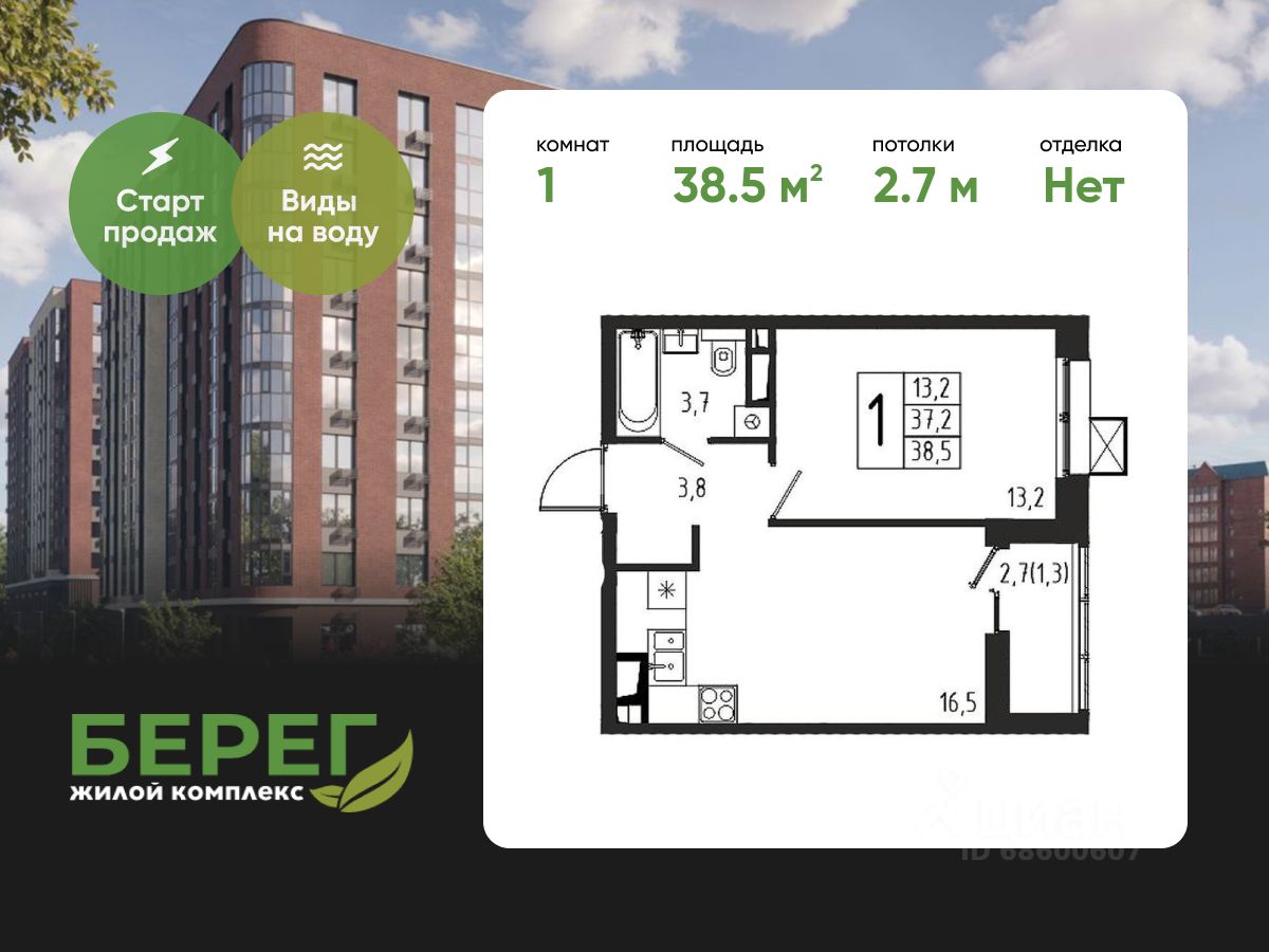 Продаётся 1-комнатная квартира в строящемся доме (Корпус 8 (2 очередь)), общей площадью 38.50 кв.м., на 3 этаже.