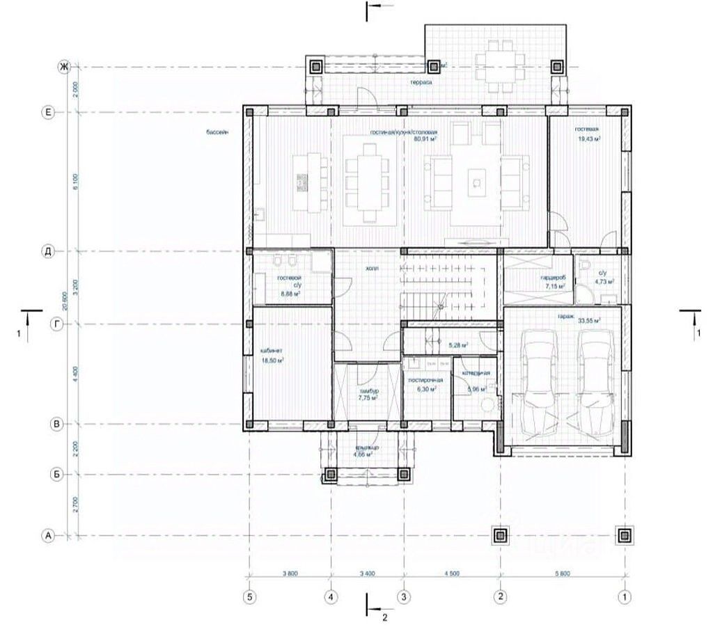 1 этаж - холл, кухня-столовая-гостиная, гостевая спальня со своим с/у и гардеробной, гостевая спальня, санузел, постирочная, бойлерная, терраса, гараж на 2 автомобиля,