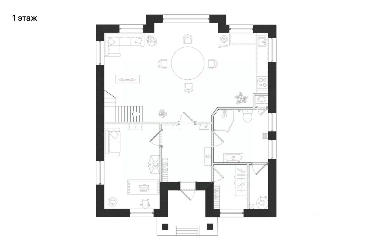 Планировка дома 4 1 этаж: прихожая, кухня-гостиная-столовая, санузел, кабинет/гостевая спальня, 2 этаж: мастер-спальня со своей ванной комнатой, две спальни, санузел.