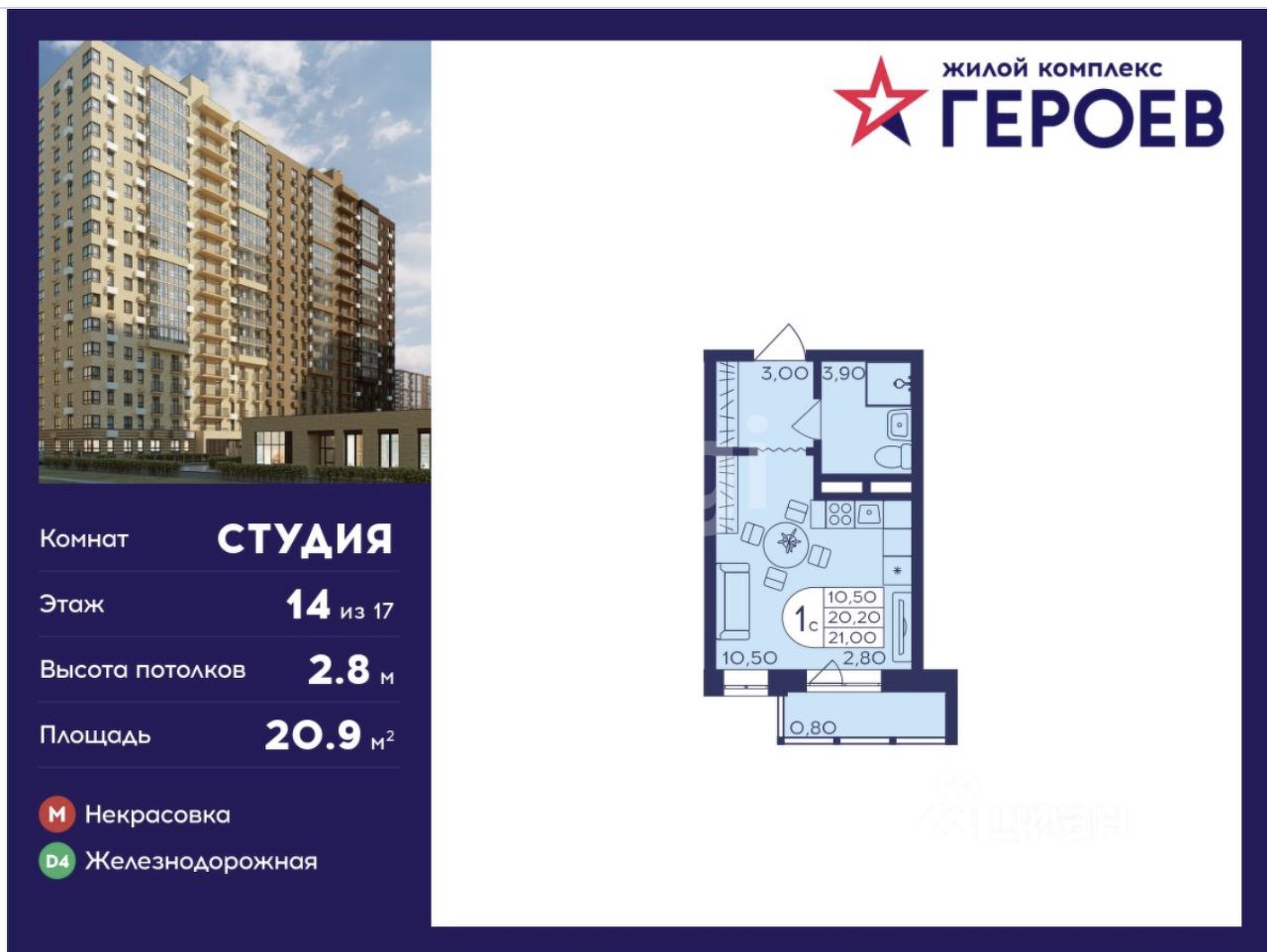 Светлая студия с отделкой в жк Героев. Преимущество -есть небольшая лоджия.