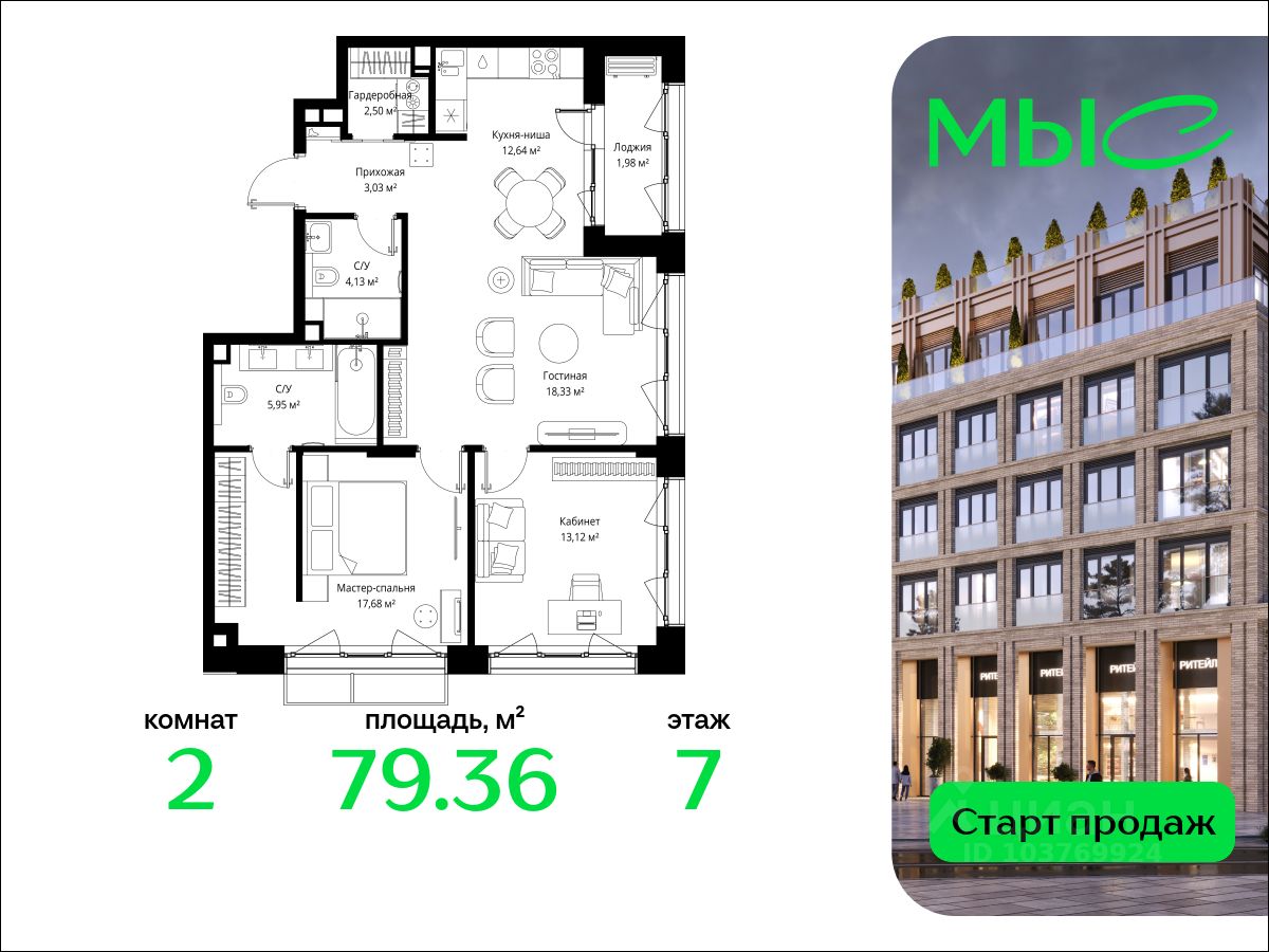 В продаже квартира площадью 79.36 кв. м без отделки на 7 этаже 10 этажного дома. Квартира находится в премиальном жилом комплексе ''МЫС'' (Застройщик - MR Group).