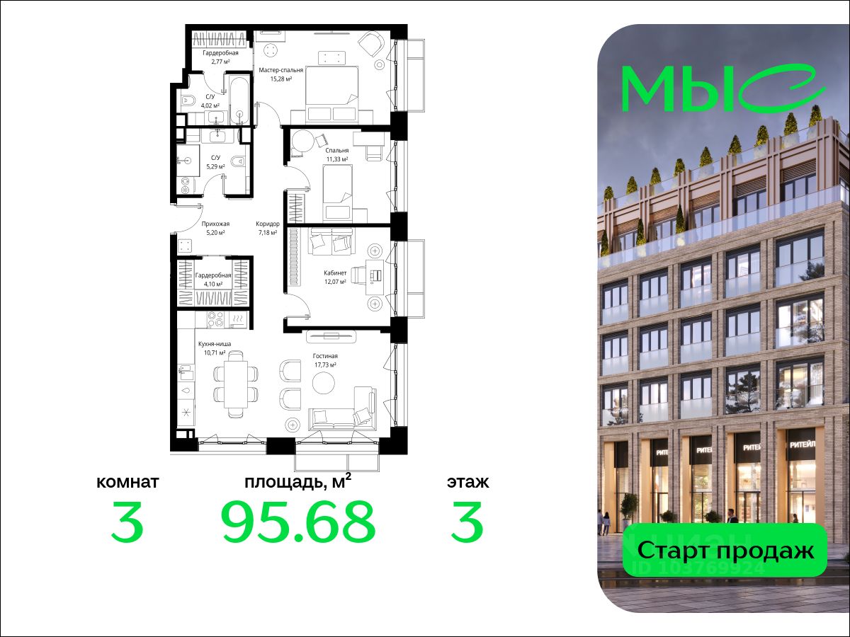 В продаже квартира площадью 95.68 кв. м без отделки на 3 этаже 6 этажного дома. Квартира находится в премиальном жилом комплексе ''МЫС'' (Застройщик - MR Group).