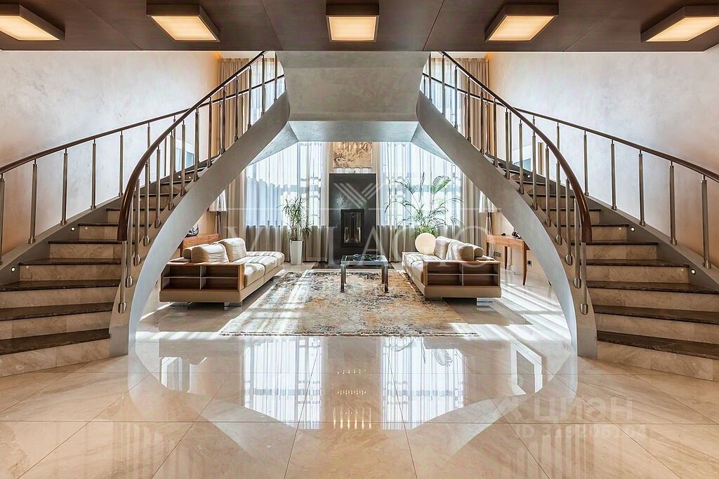 Просторный каминный зал с уникальной дизайнерской лестницей и камином дополнен панорамным двусветным остеклением. Отделка камина и балкона в зале выполнена из благородного камня оникса и эффектно дополнена подсветкой.
