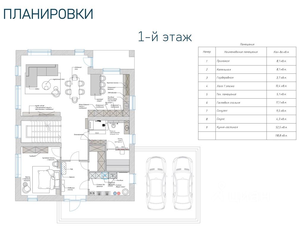 Первый этаж: гараж на 2 а\м, прихожая, гардеробная, санузел, холл, просторная кухня со столовой и гостиной и выходом на террассу, гостевая спальня, сауна, тех. Помещение.