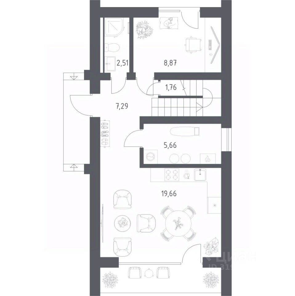 В базовую комплектацию включена металлическая входная дверь, двухкамерные стеклопакеты. Отсутствие межкомнатных перегородок позволит вам адаптировать пространство под себя.