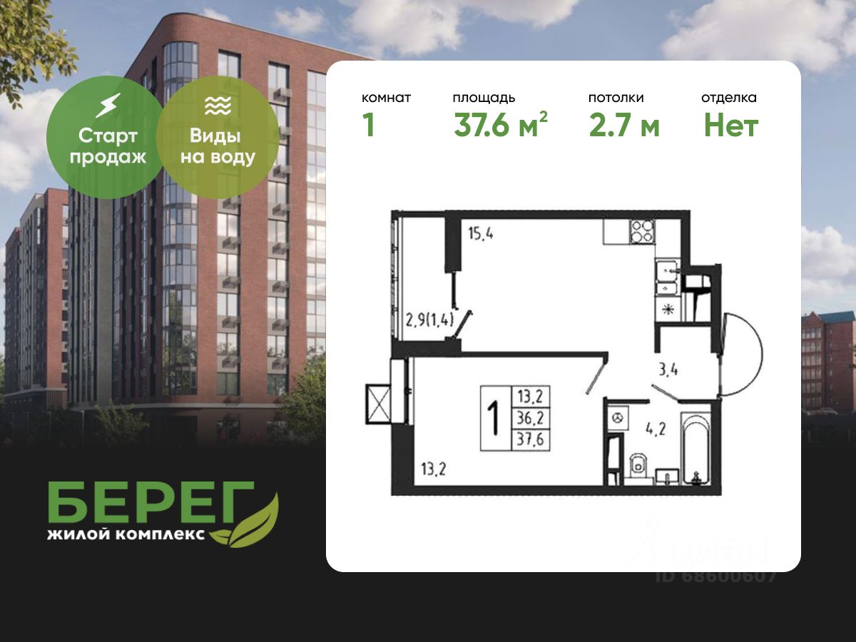 Продаётся 1-комнатная квартира в строящемся доме (Корпус 4 (2 очередь)), общей площадью 37.60 кв.м., на 2 этаже.