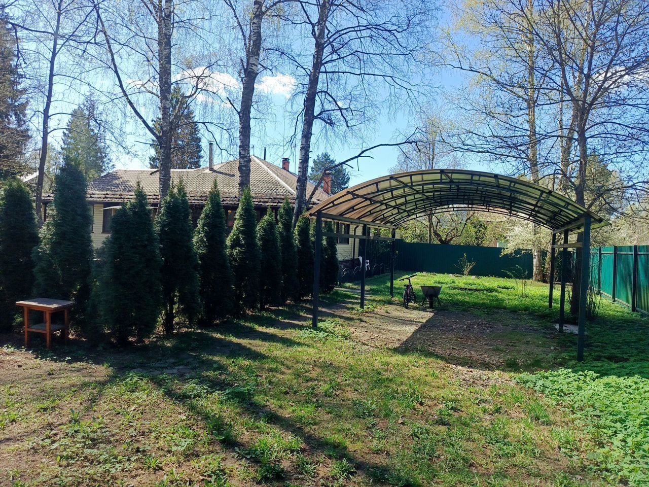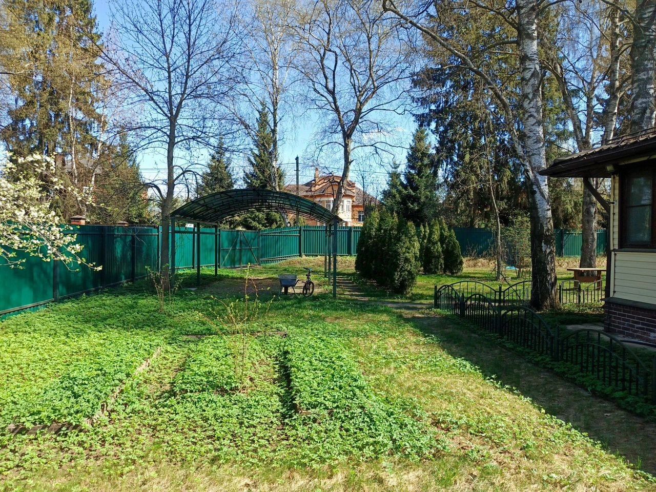 Дом окружен соседями с трех сторон, по границе железный забор, дорога - асфальт. На участке расположены два навеса для машины, несколько хозблоков, колодец, беседка, детская площадка.