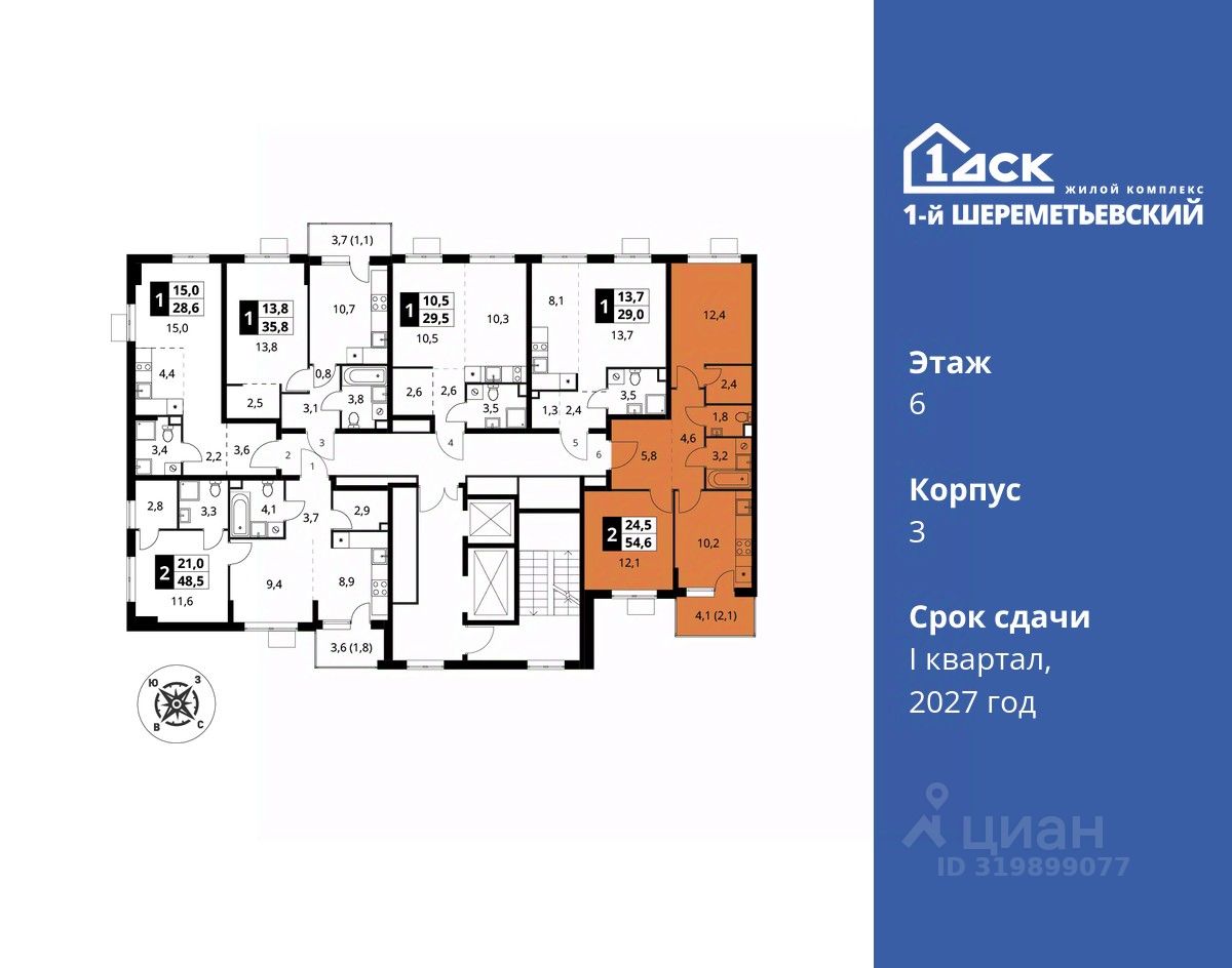 Максимальные скидки при 100% оплате. Прямая продажа от застройщика! Жилой Комплекс класса Комфорт плюс. Продаётся 2-к квартира номер 30 общей площадью 54.6 кв.м на 6-м этаже 16 этажного дома. Без отделки.