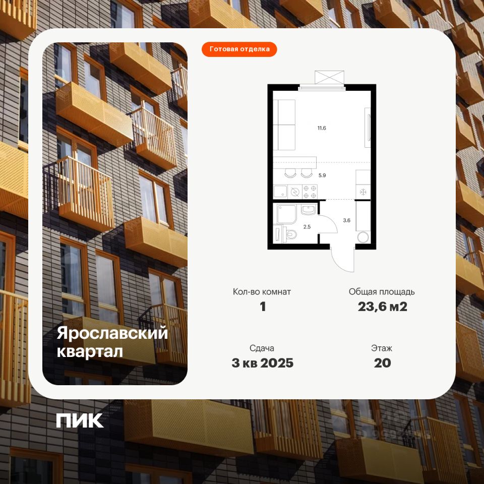 Продаётся квартира-студия площадью 23,6 кв.м на 20 этаже 25 этажного дома (Корпус 1.4, Секция 1) проекта ПИК Ярославский квартал. Светлый просторный подъезд на уровне земли, функциональная планировка, большие окна, c отделкой.