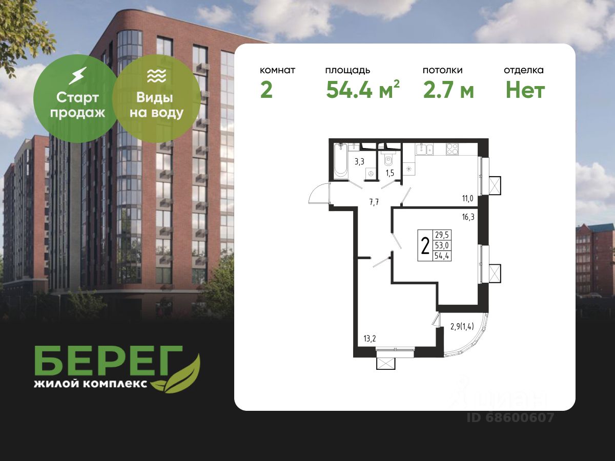 Продаётся 2-комнатная квартира в строящемся доме (Корпус 8 (2 очередь)), общей площадью 54.40 кв.м., на 9 этаже.