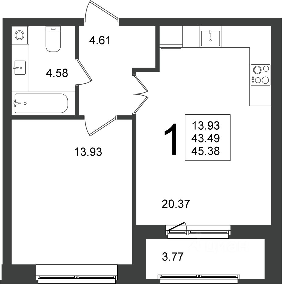 Продаётся 1-комнатная квартира в строящемся доме (Корпус 5), срок сдачи: 2-кв. 2026, общей площадью 45.38 кв.м., на 1 этаже.