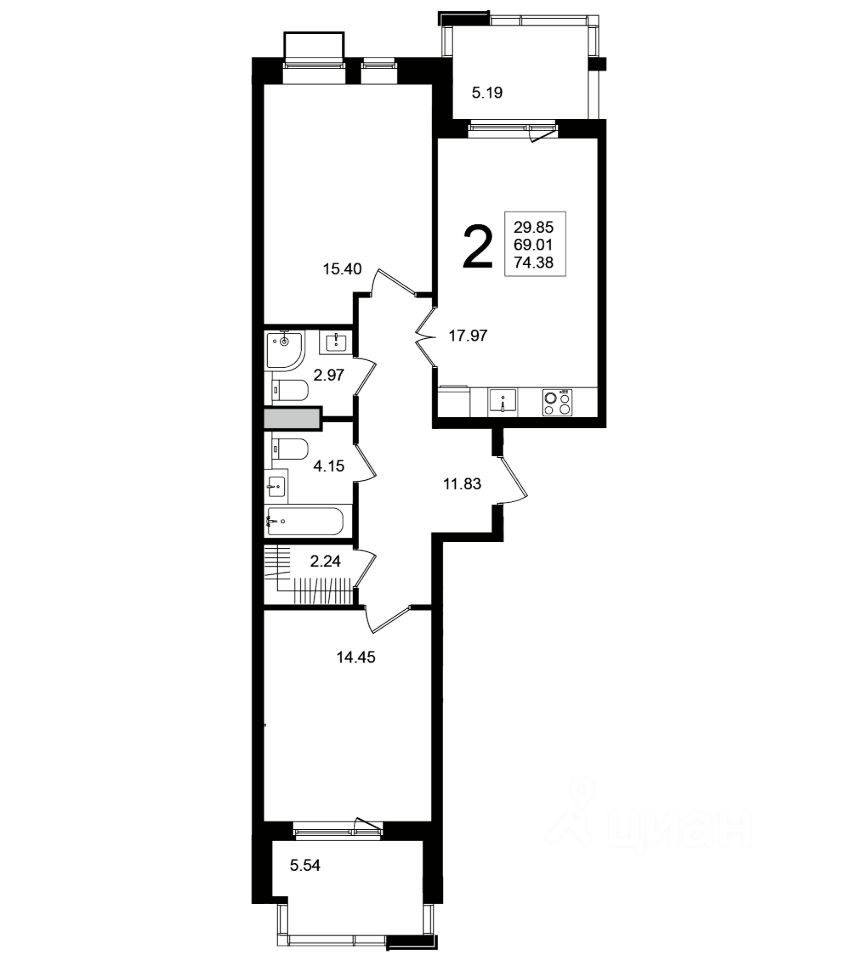 Продаётся 2-комнатная квартира в строящемся доме (Корпус 6), срок сдачи: 4-кв. 2025, общей площадью 74.38 кв.м., на 4 этаже.